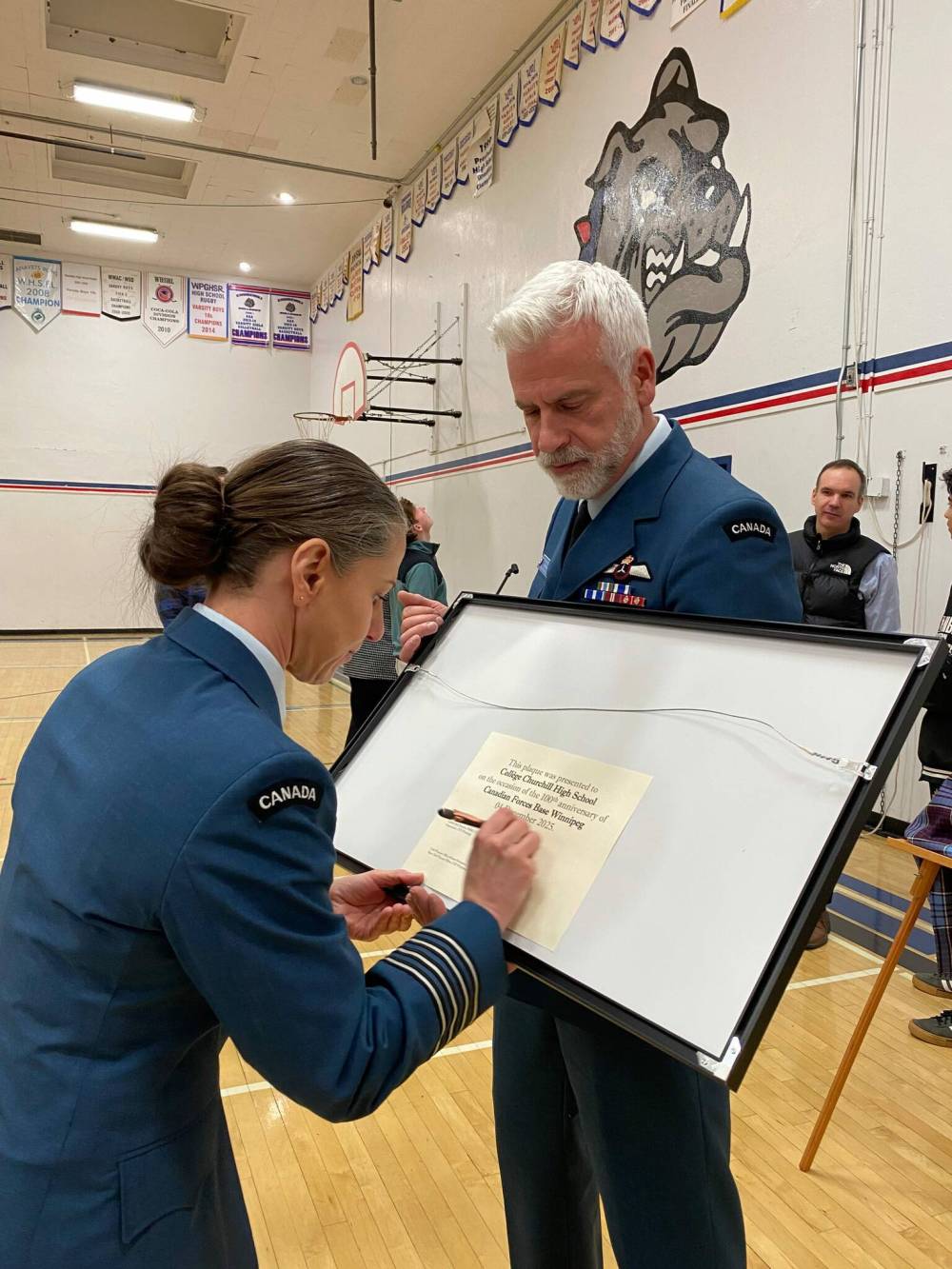 Col. Jody Hanson signs a plaque presented by the Canadian Forces to École Churchill High School on Dec. 4, commemorating the historic nature of the school site, which effectively operated as Winnipeg’s primary airport from 1920 to 1948.