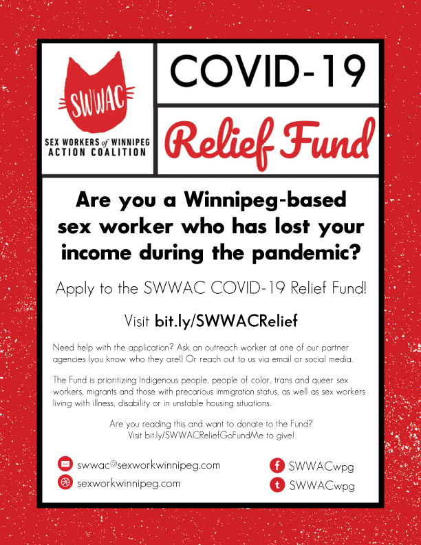Online donations have collected about $9,600 since April 21 — allowing 96 individuals to receive $100 each through the Sex Workers of Winnipeg Action Coalition. The volunteer-run organization was one of several such groups across Canada to set up coronavirus pandemic relief funds, including in Toronto, Vancouver and St. John’s.