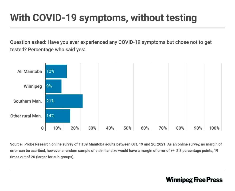 A total of 21 per cent of southern respondents who had COVID-19 symptoms admitted to not getting tested. Just 12 per cent of Manitobans overall said they hadn’t been tested while symptomatic, compared with nine per cent of Winnipeggers who fell ill.