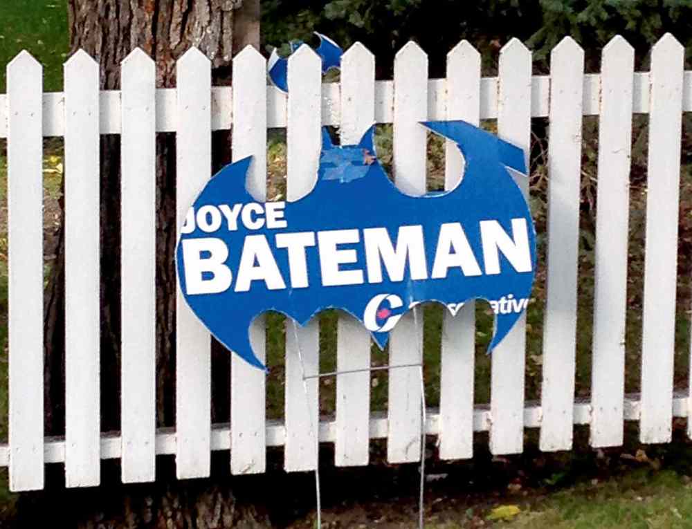 The campaign has already been dogged by the inevitable accusations of sign vandalism, which is almost always the work of teens on bikes rather than rival candidates doing dirty tricks. But one home-owner on Wellington Crescent got creative, Bob Kane-style, with a sign belonging to Conservative MP Joyce Bateman, who is in a tough fight to keep her Winnipeg South Centre seat.