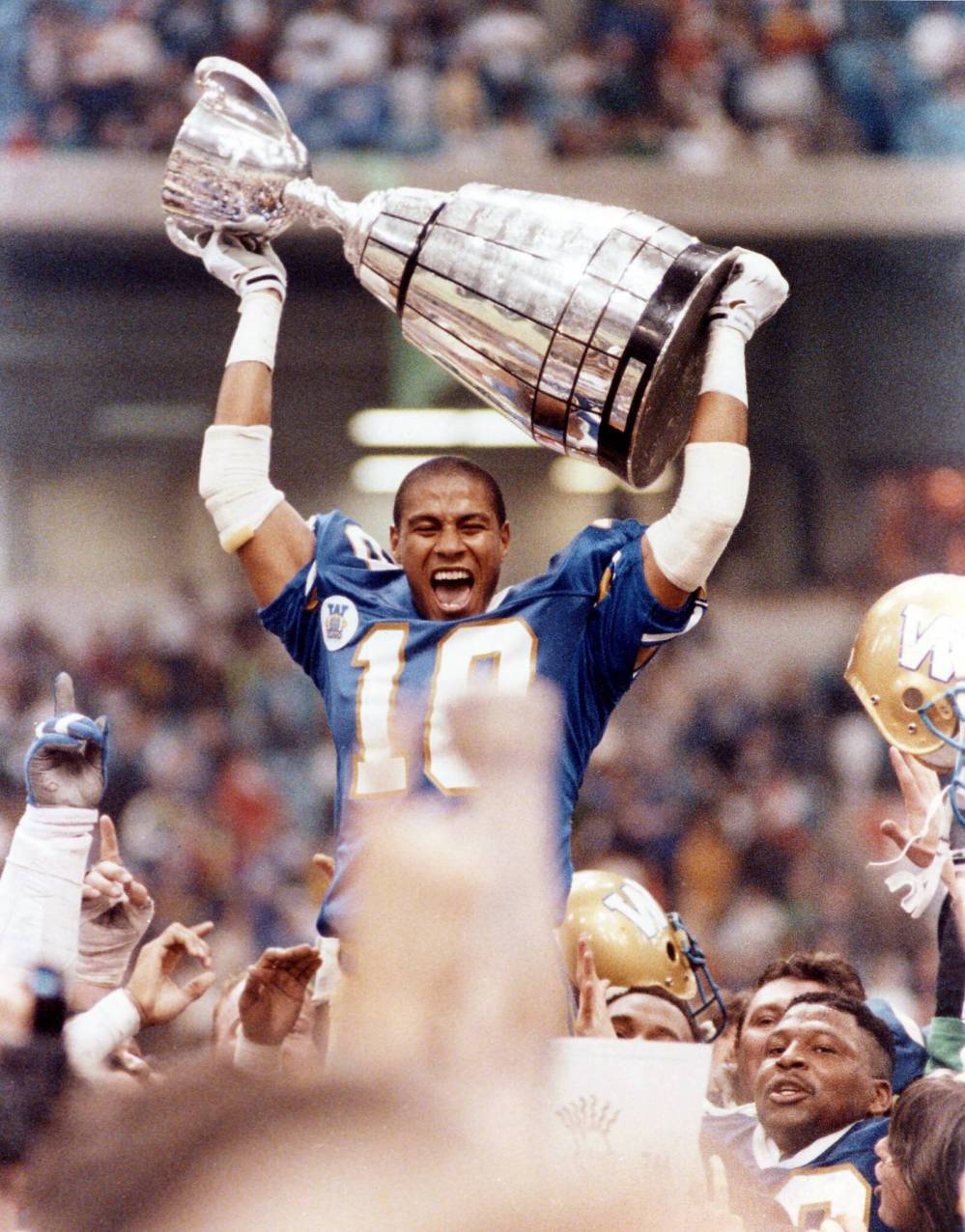 Winnipeg Blue Bombers’ Rod Hill celebrates the club’s 10th franchise Grey Cup win in 1990.