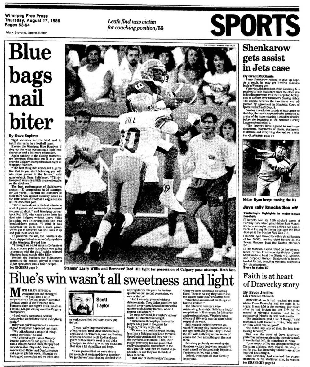 On the front of the Aug 17, 1989 Free Press sports section, Winnipeg Blue Bombers’ Rod Hill (left) breaks up the pass to Calgary Stampeders’ Larry Willis in 1989 regular-season action.
