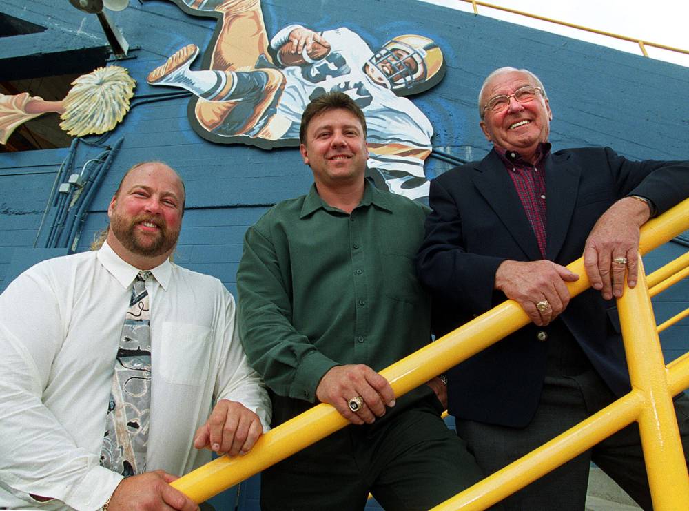 KEN GIGLIOTTI / FREE PRESS FILES Winnipeg Blue Bombers’ Stan Mikawos is inducted into the Bombers Hall of Fame in 2000. From left: Chris Walby, Mikawos, Earle Hiebert.