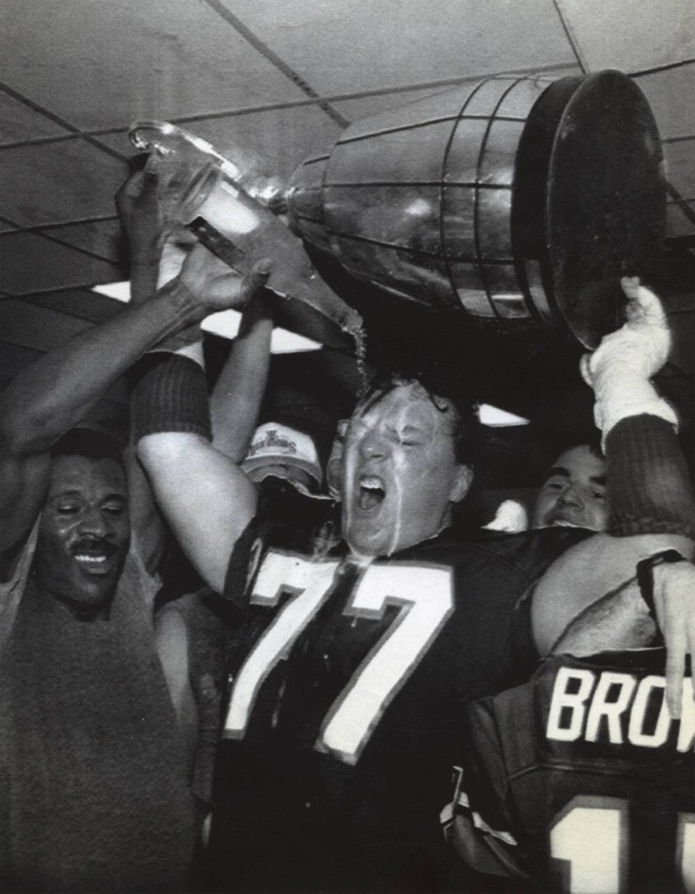 This is 1990, we go from your first Grey Cup victory to now your third and final one. This is in the locker room after the 1990 Grey Cup win over Edmonton. Another runaway victory for you guys, 50-11 over Edmonton in that one. And this is you hoisting the silver mug while getting soaked with champagne.