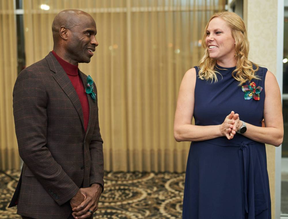 Manitoba Sports Hall of Fame inductees Milt Stegall (left) and Kelly Stefanyshyn (right) prior to being inducted at the Annual Induction Ceremony at the Victoria Inn Hotel & Convention Centre Thursday.