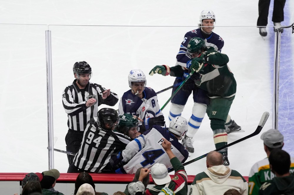 Then, in the second period, Iafallo drew the ire of Minnesota’s Joel Eriksson Ek and Yakov Trenin just in front of the Winnipeg net. While the trio exchanged plenty of shoves and gloved swats, play continued up the ice with the Jets having a numbers advantage.