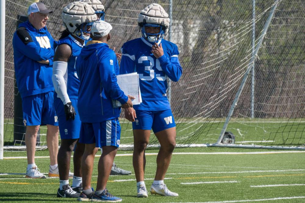 Linebacker Jaylen Smith (right) runs drills at the Winnipeg Blue Bombers’ rookie camp on Wednesday.