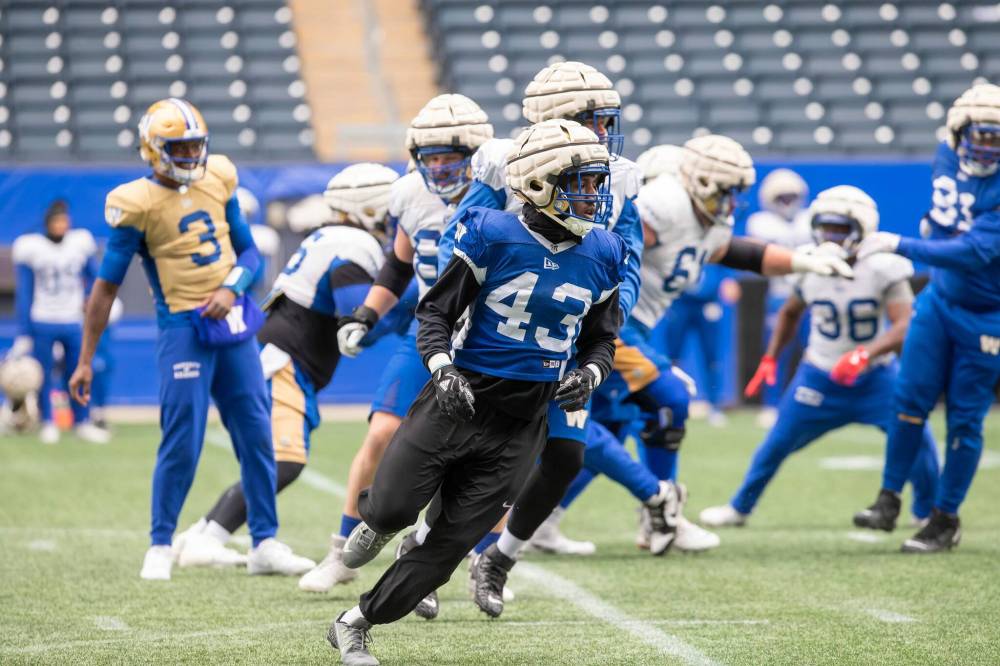 Winnipeg Blue Bombers defensive lineman Kemari Munier-Bailey (43) takes part in scrimmage during training camp at Princess Auto Stadium in Winnipeg, Sunday.