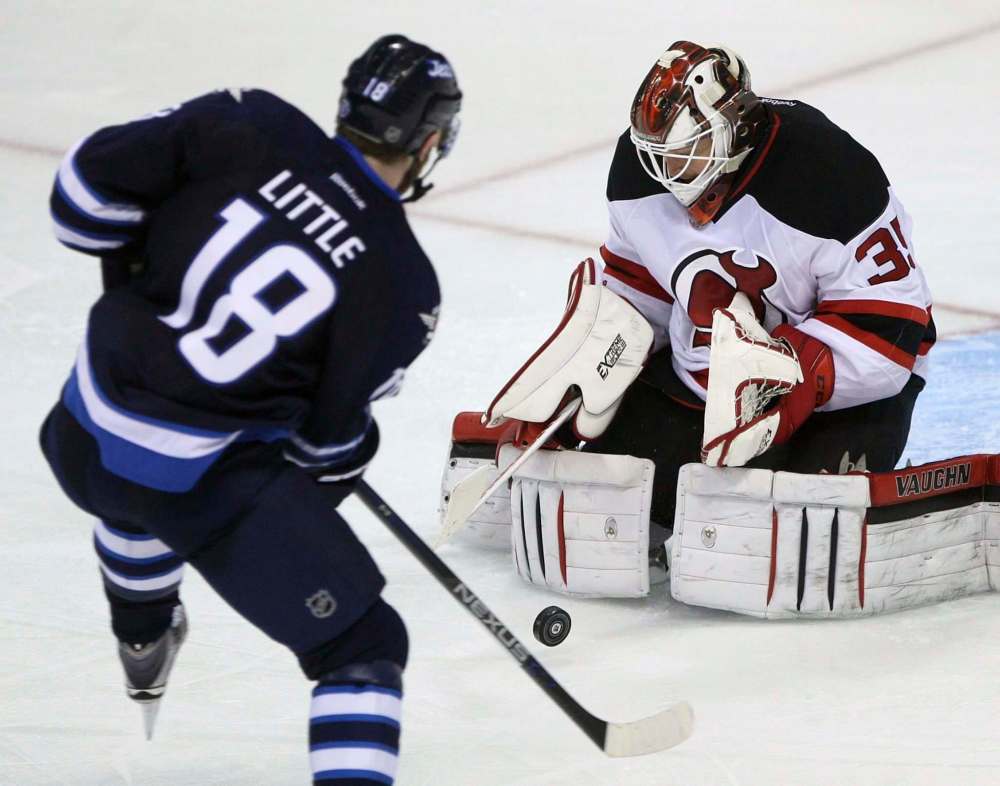 Winnipeg Jets Bryan Little is robbed by New Jersey Devils goaltender Cory Schneider Tuesday night at the MTS Centre.
