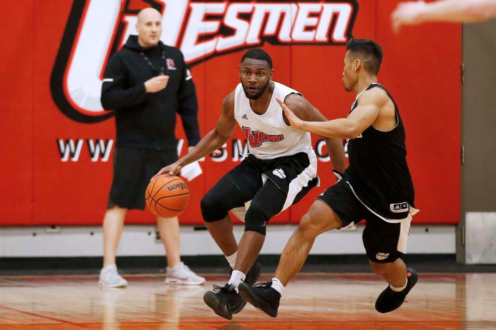 The University of Winnipeg Wesmen’s Narcisse Ambanza practices with his team at the University of Winnipeg as head coach Mike Raimbault looks on Tuesday.