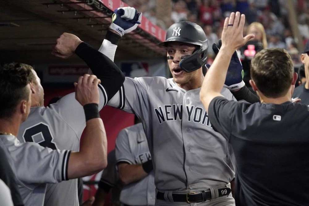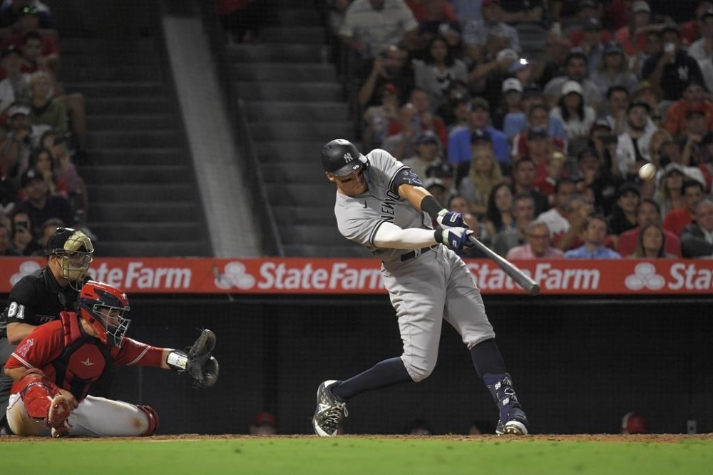 ANAHEIM, Calif. (AP) — Aaron Judge hit his 50th home run of the season Monday night, connecting in the eighth inning for the New York Yankees against the Los Angeles Angels.