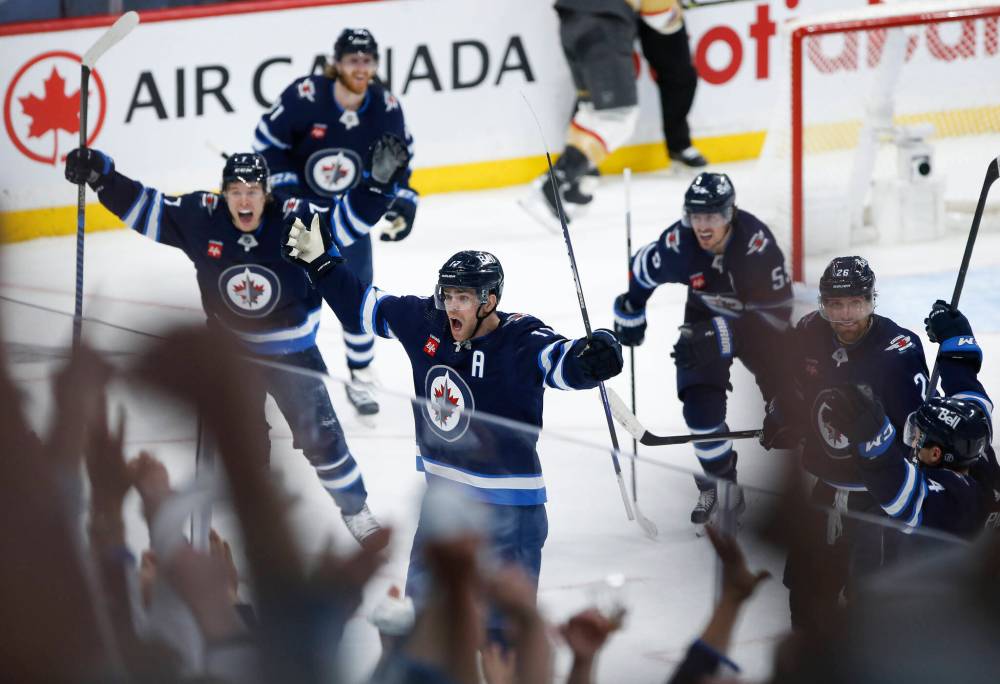 Winnipeg Jets’ Adam Lowry (17) celebrates his game tying goal against the Vegas Golden Knights late in third period of NHL playoff action in Winnipeg on Saturday, April 22, 2023.