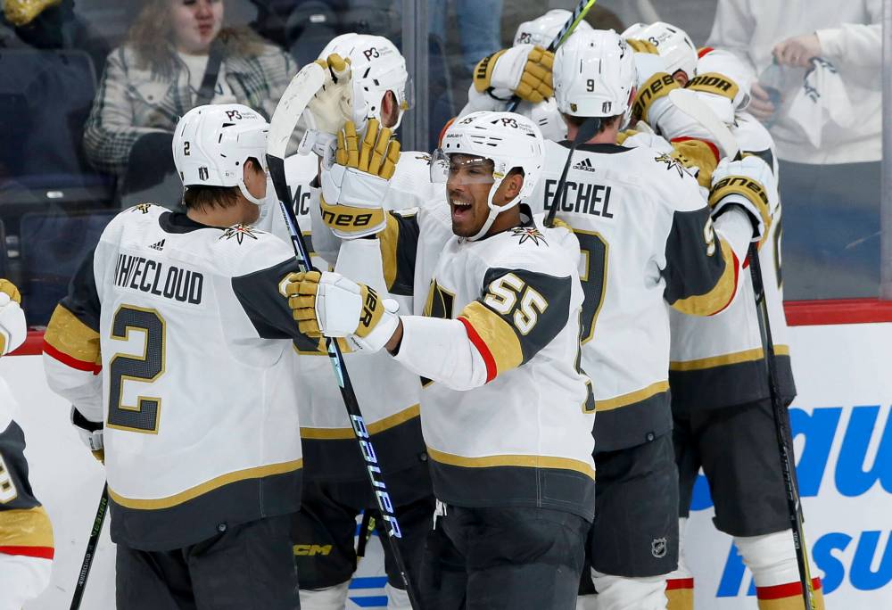 JOHN WOODS / THE CANADIAN PRESS Vegas Golden Knights celebrate their win over the Winnipeg Jets during the second overtime period in NHL playoff action Saturday.