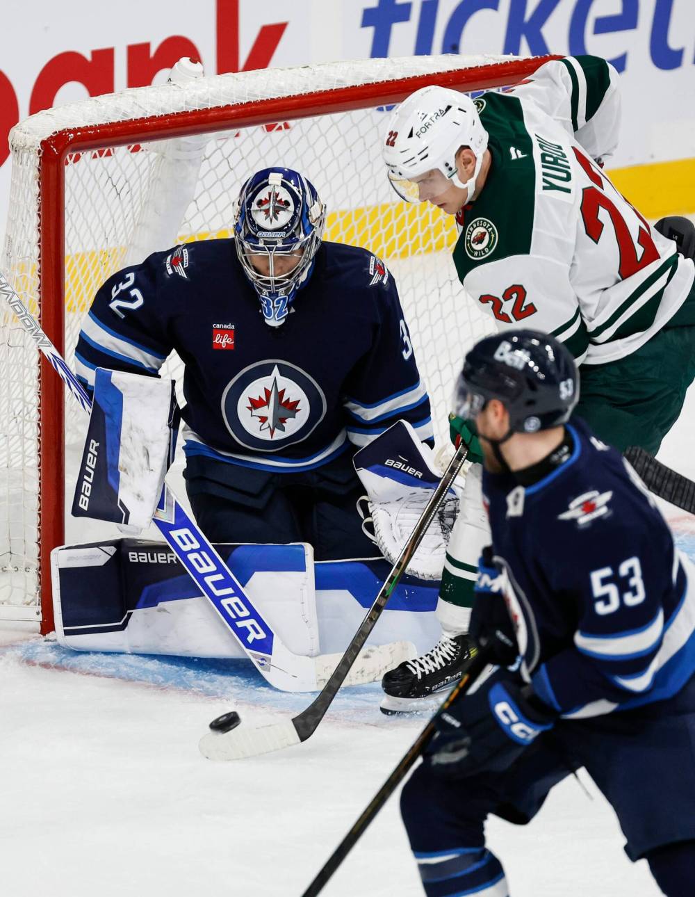 Winnipeg Jets goaltender Thomas Milic (32) gets his stick on the tip from Minnesota Wild’s Danila Yurov (22) during second period pre-season NHL action in Winnipeg on Sunday, September 21, 2025.F COLBY BARLOW (1st round, 2023): The rookie is starting to find his stride, now with five points (2G, 3A) through 24 games. He went down with injury last week but isn’t expected to miss significant time.