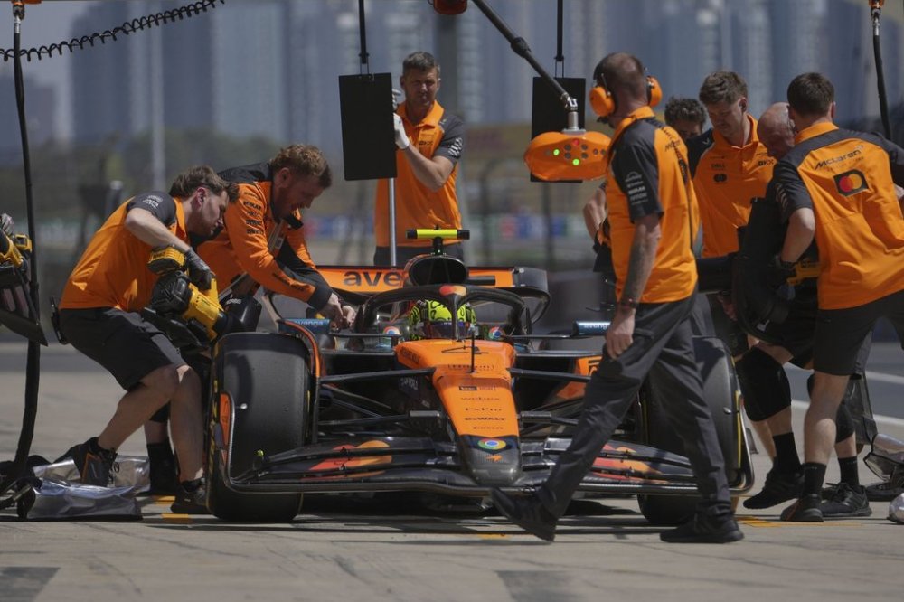 McLaren driver Lando Norris of Britain gets a pit stop during the first free practice at the Shanghai International Circuit in Shanghai, China, Friday, March 21, 2025, ahead of the Chinese Formula One Grand Prix (Sunday). (AP Photo/Andy Wong)