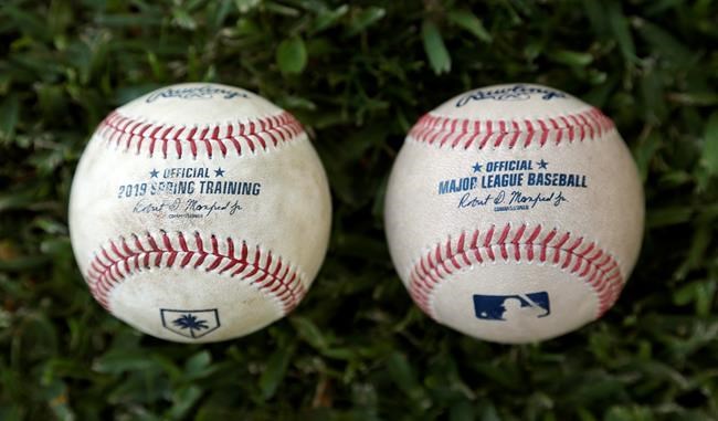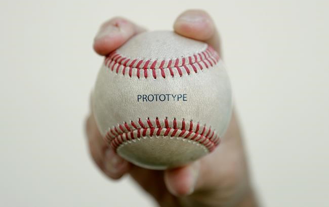 Major League Baseball's new prototype baseball is shown Wednesday, March 20, 2019, in Clearwater, Fla. (AP Photo/Chris O'Meara)