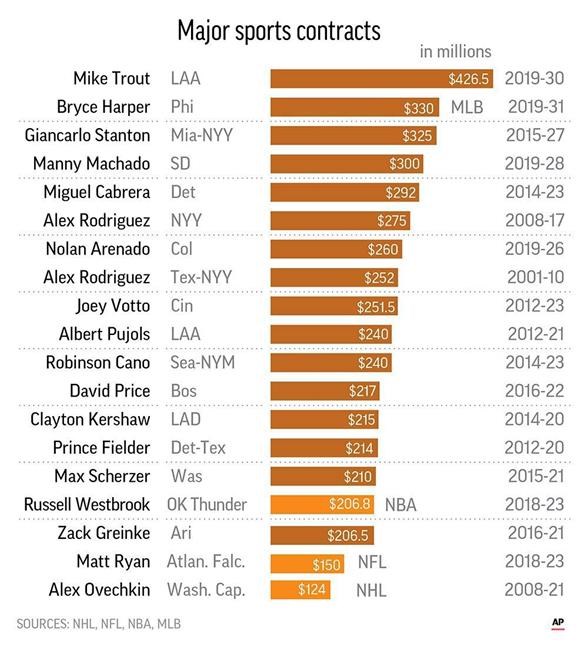 The Angels also secured Trout’s commitment despite three consecutive losing seasons. Manager Brad Ausmus has taken over for Mike Scioscia, but the Angels made only a handful of moderately priced free-agent additions to their roster.