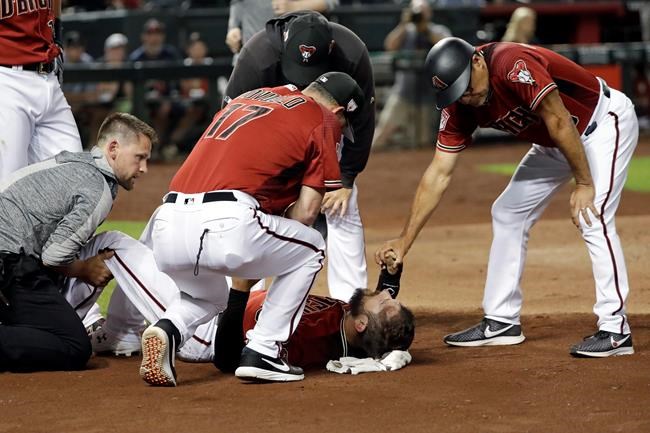 “Just a very unfortunate incident,” Diamondbacks manager Torey Lovullo said. “I saw the tracks on home plate. I saw the tracks leaving home plate. These athletes are so strong, you put a little extra force on some cleats, you just don’t know how it is going to respond. The only thing I remember is him flying across the air.”