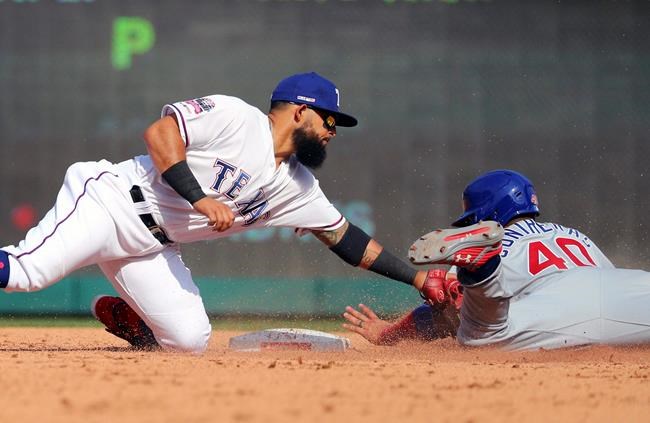 Texas Rangers second baseman Rougned Odor (12) tags out Chicago Cubs Willson Contreras (40) on a steal attempt during the fifth inning of a baseball game Thursday, March 28, 2019 in Arlington, Texas. (AP Photo/Richard W. Rodriguez)