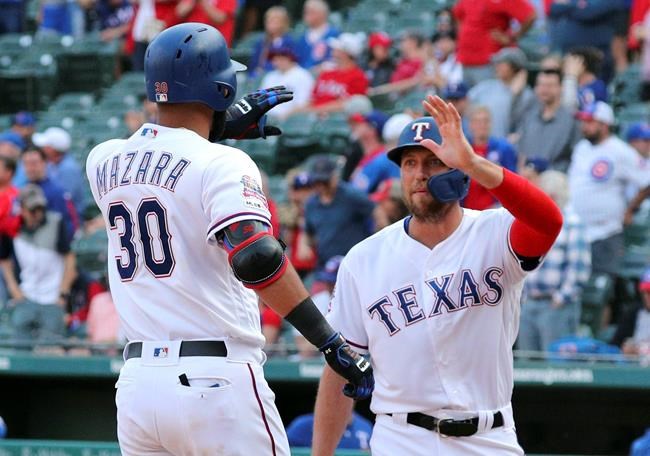 Texas Rangers right fielder Nomar Mazara (30) is greeted at the plate by Hunter Pence after a two-run home run in the ninth inning of a baseball game against the Chicago Cubs Thursday, March 28, 2019 in Arlington, Texas. (AP Photo/Richard W. Rodriguez)