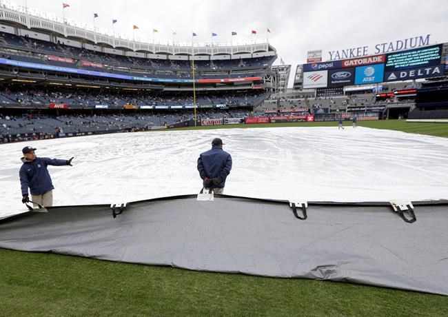 Members of the grounds crew pull the tarp off the field during a rain delay before a baseball game between the New York Yankees and the Baltimore Orioles at Yankee Stadium, Sunday, March 31, 2019, in New York. (AP Photo/Seth Wenig)