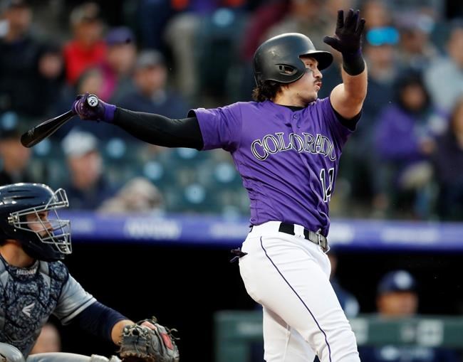 Colorado Rockies' Tony Wolters follows through on a single off San Diego Padres starting pitcher Joey Lucchesi during the fifth inning of a baseball game Saturday, May 11, 2019, in Denver. (AP Photo/David Zalubowski)