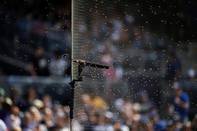 There were still a few bees buzzing around near the Padres’ on-deck circle later in the game.