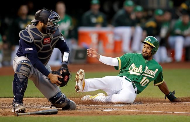 Omar Narvaez hit two homers for Seattle. Narvaez connected in the second before the A’s answered in the third with Chapman’s two-run single.