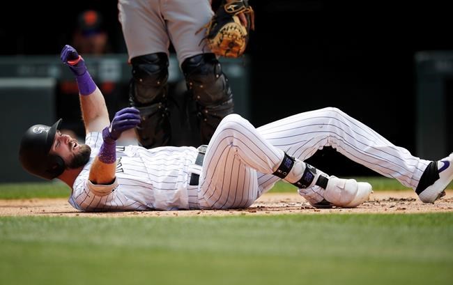 Colorado Rockies' David Dahl rolls on the ground after fouling a pitch off his foot while facing San Francisco Giants starting pitcher Shaun Anderson in the first inning of a baseball game Wednesday, July 17, 2019, in Denver. Dahl remained in the game. (AP Photo/David Zalubowski)