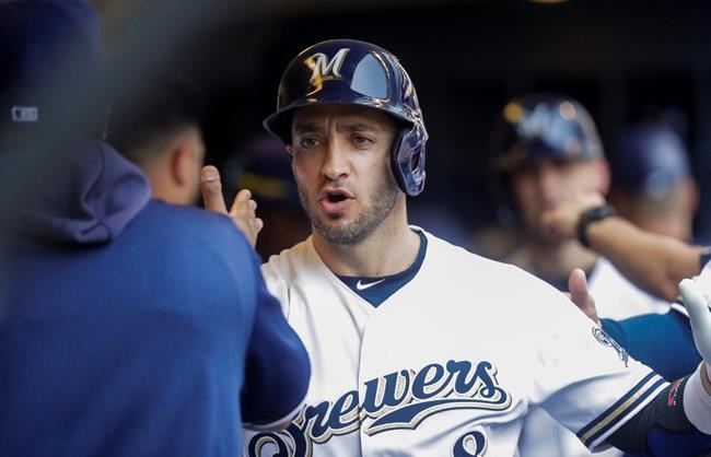 Milwaukee Brewers' Ryan Braun is congratulated after hitting a two-run home run during the first inning of a baseball game against the Cincinnati Reds Wednesday, July 24, 2019, in Milwaukee. (AP Photo/Morry Gash)