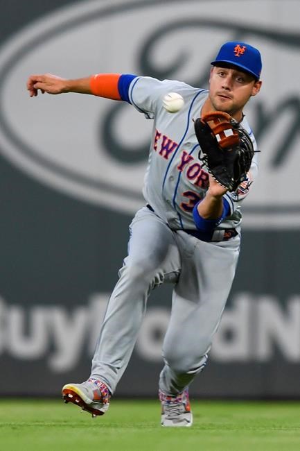 New York Mets right fielder Michael Conforto catches a line drive off the bat of Atlanta Braves' Freddie Freeman during the first inning of a baseball game Wednesday, Aug. 14, 2019, in Atlanta. (AP Photo/John Amis)