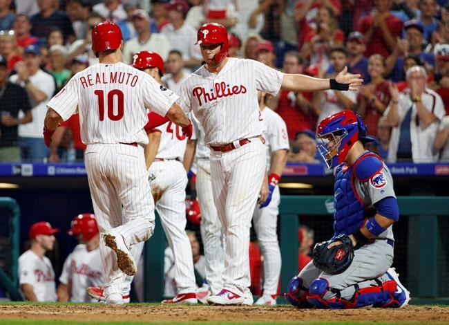 Philadelphia Phillies' J.T. Realmuto, left, celebrates his grand slam with Rhys Hoskins, center, as Chicago Cubs catcher Victor Caratini, right, looks down during the third inning of a baseball game Wednesday, Aug. 14, 2019, in Philadelphia. (AP Photo/Chris Szagola)