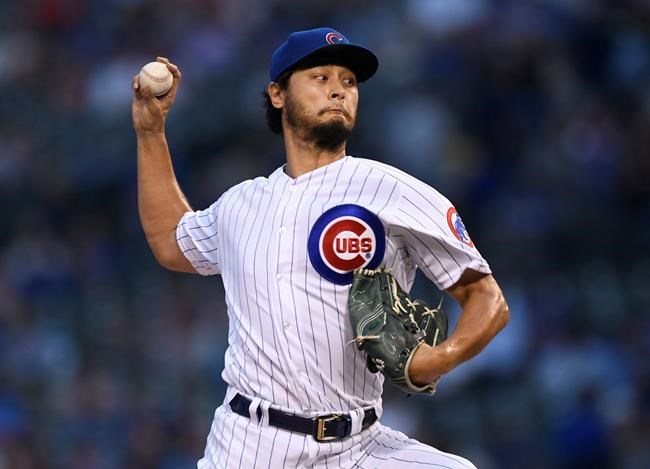 Chicago Cubs starter Yu Darvish delivers a pitch during the first inning of the team's baseball game against the San Francisco Giants on Wednesday, Aug 21, 2019, in Chicago. (AP Photo/Paul Beaty)