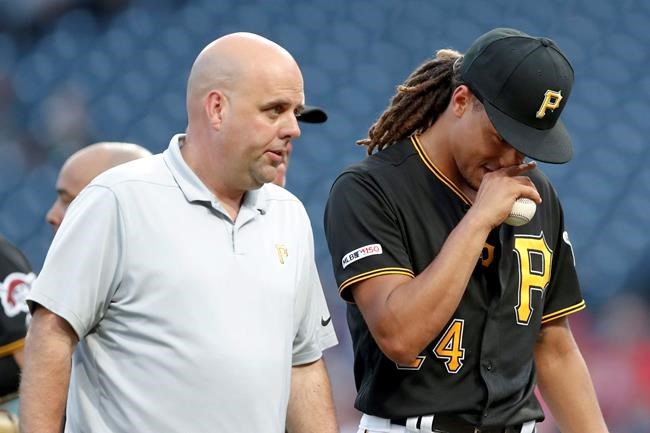 Pittsburgh Pirates starting pitcher Chris Archer, right, leaves the field with trainer Bryan Housand before the start of the second inning in a baseball game against the Washington Nationals, Tuesday, Aug. 20, 2019, in Pittsburgh. (AP Photo/Keith Srakocic)