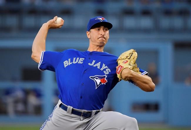 Toronto Blue Jays starting pitcher Jacob Waguespack throws during the first inning of the team's baseball game against the Los Angeles Dodgers on Thursday, Aug. 22, 2019, in Los Angeles. (AP Photo/Mark J. Terrill)