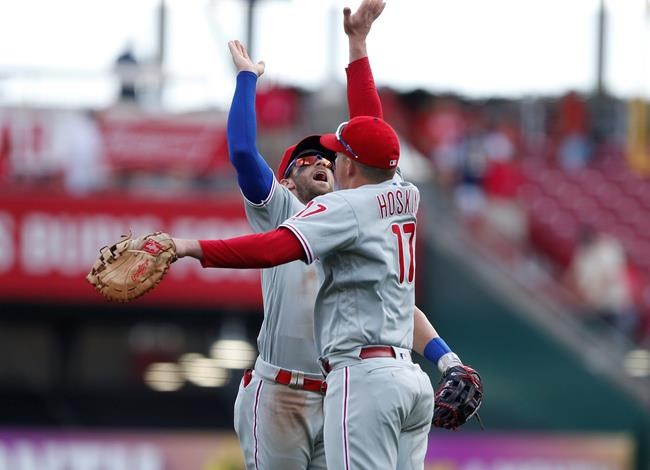 Hoskins responded in the third with his 26th homer, a two-out, two-run blast into the Reds’ bullpen. He briefly celebrated by raising his right fist for a few steps between first and second base.
