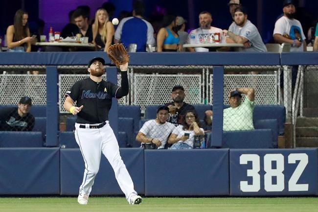 Adam Conley (2-8) started the seventh in relief of Marlins starter Caleb Smith and allowed Bubba Starling’s leadoff infield single and walked pinch hitter Cheslor Cuthbert. Miami left-fielder Austin Dean muffed Whit Merrifield’s single that allowed Starling to score from third on the error and tie it at 1.