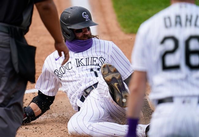 Colorado Rockies' Charlie Blackmon slides safely across home plate to score on a single hit by Josh Fuentes in the sixth inning of a baseball game Sunday, Sept. 20, 2020, in Denver. (AP Photo/David Zalubowski)