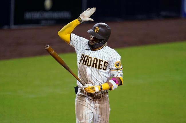 Eric Hosmer, whose grand slam on Aug. 20 made the Padres the first team to hit a slam in four straight games, came up with the bases loaded and no outs in the first and hit a sacrifice fly. Fernando Tatis Jr. was thrown out trying to steal third and Tommy Pham struck out.