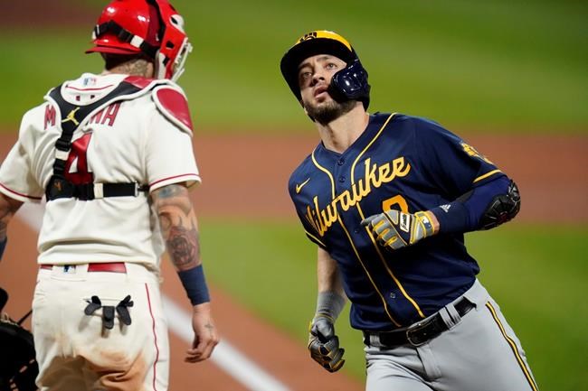 Milwaukee Brewers' Ryan Braun, right, scores past St. Louis Cardinals catcher Yadier Molina after hitting a solo home run during the fourth inning of a baseball game Saturday, Sept. 26, 2020, in St. Louis. (AP Photo/Jeff Roberson)
