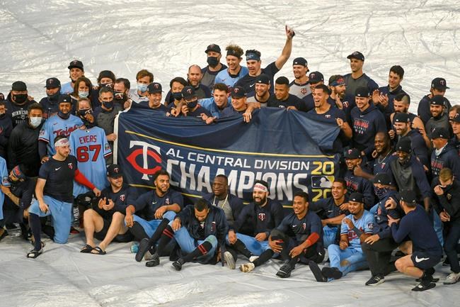 Members of the AL Central champions Minnesota Twins pose for a photo in the rain after their baseball game with the Cincinnati Reds, Sunday, Sept. 27, 2020, in Minneapolis. Twins clinched the AL Central championship with the Chicago White Sox's loss. The Reds won 5-3. (AP Photo/Craig Lassig)