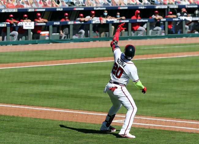 Ronald Acuña Jr. had three hits for the NL East champions, including a run-scoring double in the fifth. After winning Wednesday’s series opener 1-0 in 13 innings, Atlanta broke open Game 2 on two-run homers by Ozuna and Duvall off Raisel Iglesias in the eighth.
