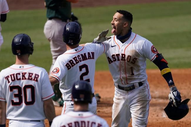 Houston Astros' Carlos Correa, right, celebrates after hitting a three-run home run that scored Kyle Tucker (30) and Alex Bregman (2) during the fourth inning of Game 4 of a baseball American League Division Series against the Oakland Athletics in Los Angeles, Thursday, Oct. 8, 2020. (AP Photo/Ashley Landis)