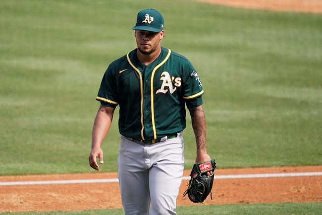 Oakland Athletics pitcher Frankie Montas walks to the dugout after being relieved during the fourth inning of Game 4 of a baseball American League Division Series against the Houston Astros in Los Angeles, Thursday, Oct. 8, 2020. (AP Photo/Marcio Jose Sanchez)