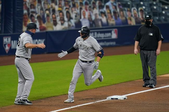 New York Yankees catcher Kyle Higashioka (66) is congratulated by third base coach Phil Nevin after hitting a solo home run against the Tampa Bay Rays during the fifth inning in Game one of a baseball American League Division Series Monday, Oct. 5, 2020, in San Diego. (AP Photo/Gregory Bull)
