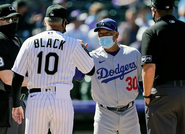 Colorado Rockies manager Bud Black, left, exchanges lineup cards at home plate with Los Angeles Dodgers manager Dave Roberts before the first inning of a baseball game Thursday, April 1, 2021, in Denver. (AP Photo/David Zalubowski)