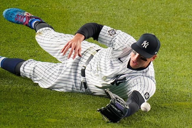 New York Yankees' Aaron Judge dives for a ball hit by Tampa Bay Rays' Manuel Margot during the sixth inning of a baseball game Friday, April 16, 2021, in New York. Margot singled. (AP Photo/Frank Franklin II)