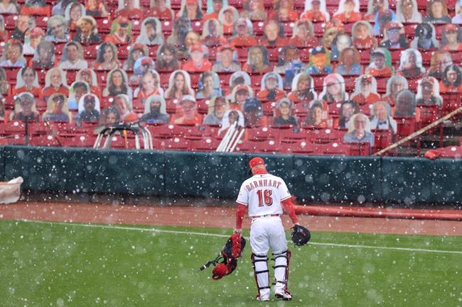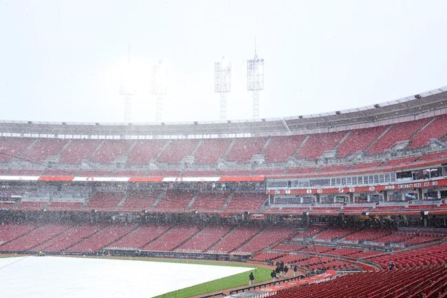 The restart of the suspended game was delayed 25 minutes because of a band of heavy snow that passed through the Cincinnati area during which the Reds played Christmas music in the stadium.