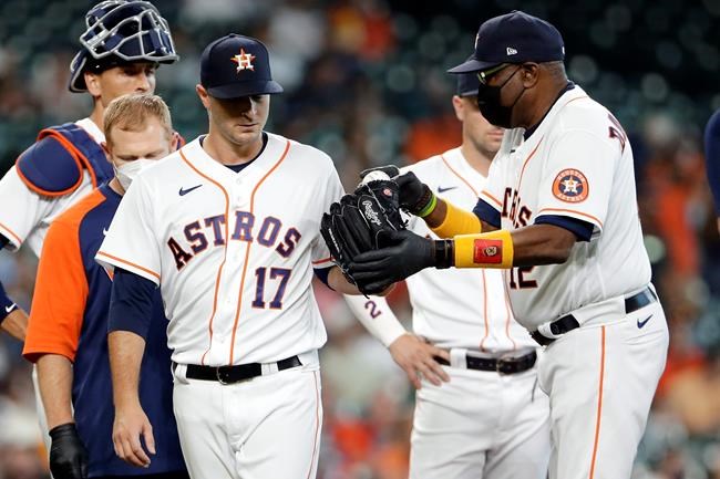Houston manager Dusty Baker and trainers talked to Odorizzi for a couple of minutes before he was taken out of the game. Kent Emanuel relieved and made his major league debut after seven years in the minors.