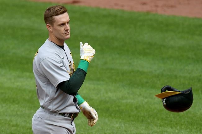 Oakland Athletics' Mark Canha reacts after striking out against the Baltimore Orioles in the eighth inning of a baseball game, Sunday, April 25, 2021, in Baltimore. (AP Photo/Will Newton)
